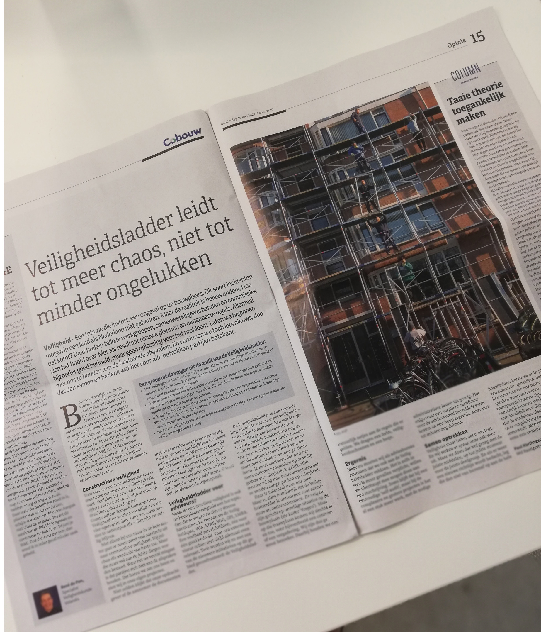Veiligheid in de bouw is essentieel. Hoe we die kunnen verbeteren, daar breken talloze werkgroepen, samenwerkingsverbanden en commissies zich het hoofd over. Met als resultaat nieuwe plannen en aangepaste regels. Allemaal bijzonder goed bedoeld, maar geen oplossing voor het probleem. Laten we beginnen met ons te houden aan de bestaande afspraken. En verzinnen we toch iets nieuws, doe dat dan samen en bedenk wat het voor alle betrokken partijen betekent. Lees het vandaag gepubliceerde opinieartikel van Paul Korthagen en Rob Stark in Cobouw.