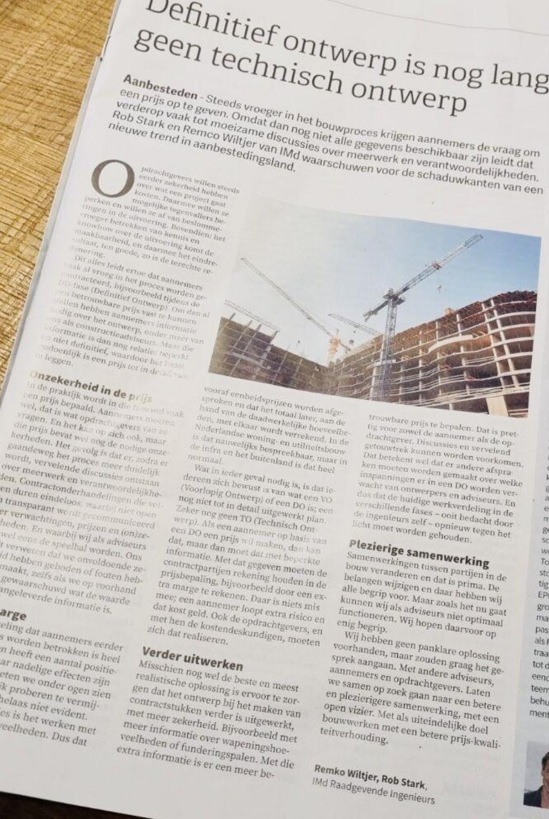 Het nu al veel besproken rondetafelgesprek bij IMd Raadgevende Ingenieurs ‘Een DO (definitief ontwerp) is nog lang geen TO (technisch ontwerp)’ is live te volgen op 12 april van 15:00 -16:30 uur. Samen met een aantal belangrijke spelers uit de bouwwereld gaan wij met elkaar het gesprek aan over een eerder door ons geplaatste opinie in Cobouw. Meeluisteren en discussiëren kan via een online stream. Het enige wat u hoeft te doen is vooraf online aanmelden. Deelname is gratis!