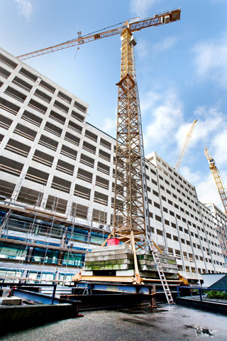 Ook voor de plaatsing van de twee bouwkranen wordt de bestaande draagkracht maximaal aangesproken. Aan de krappe voorzijde was te weinig ruimte voor de kranen. Plaatsing op het dak was technisch mogelijk, alleen zouden er dan stempeltorens in het gebouw komen. Die konden niet worden gecombineerd met de werkzaamheden binnen. Daarom is ervoor gekozen om ze op de bestaande meerlaagse parkeergarage te plaatsen, aan de achterkant.