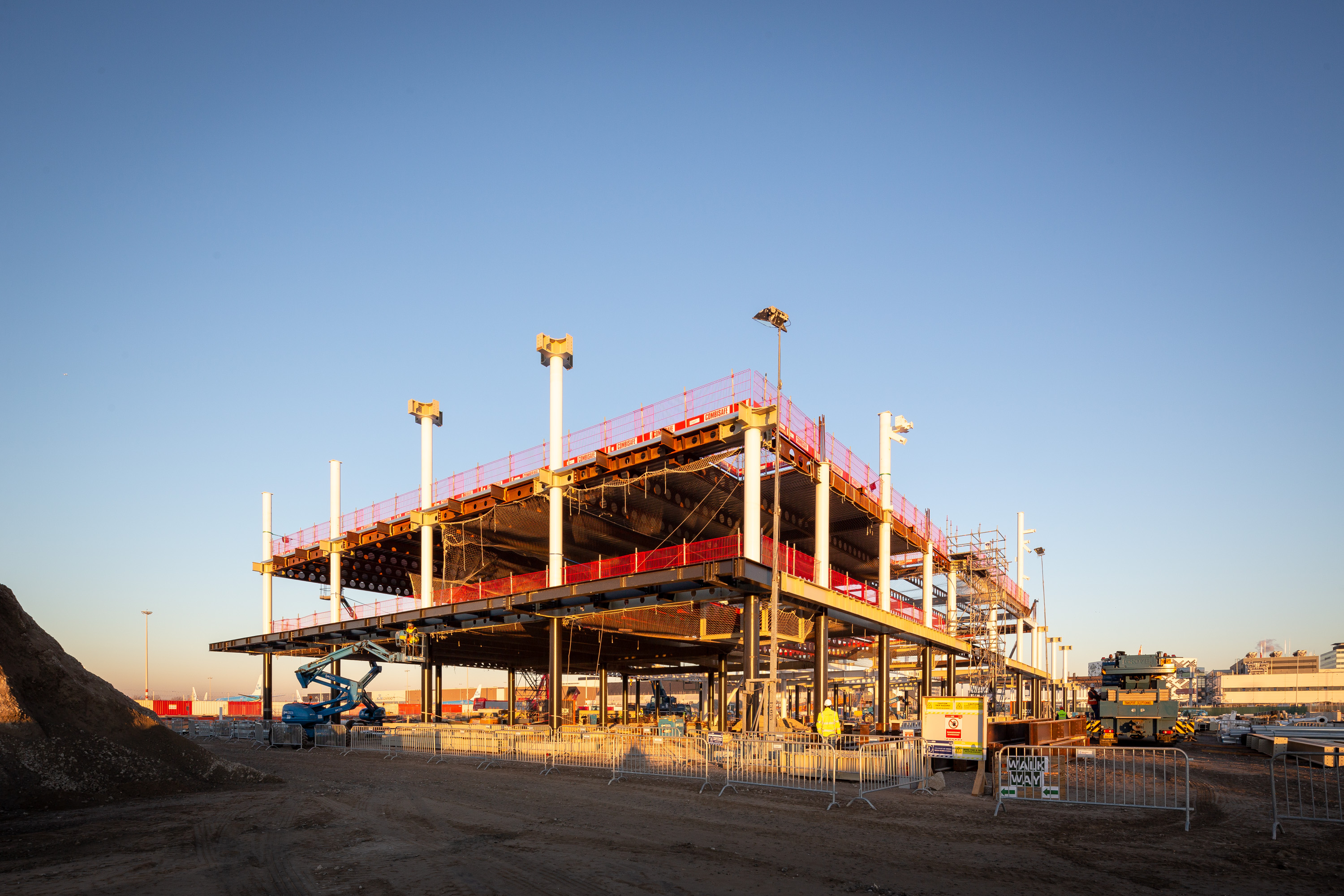 De pier, die bijna 400 meter lang is en grotendeels een hoogte van vier lagen heeft, wordt uitgevoerd in 6 verschillende fasen.  Voor 4 fasen zijn de kanaalplaten op de begane grondvloer aangebracht en is de staalconstructie gereed tot en met de 2e verdieping. De eerste kolommen voor de 3e en 4e verdieping zijn reeds zichtbaar. De verdiepingsvloeren, bestaande uit staalplaatbetonvloeren, zijn voor een deel ook al gestort.