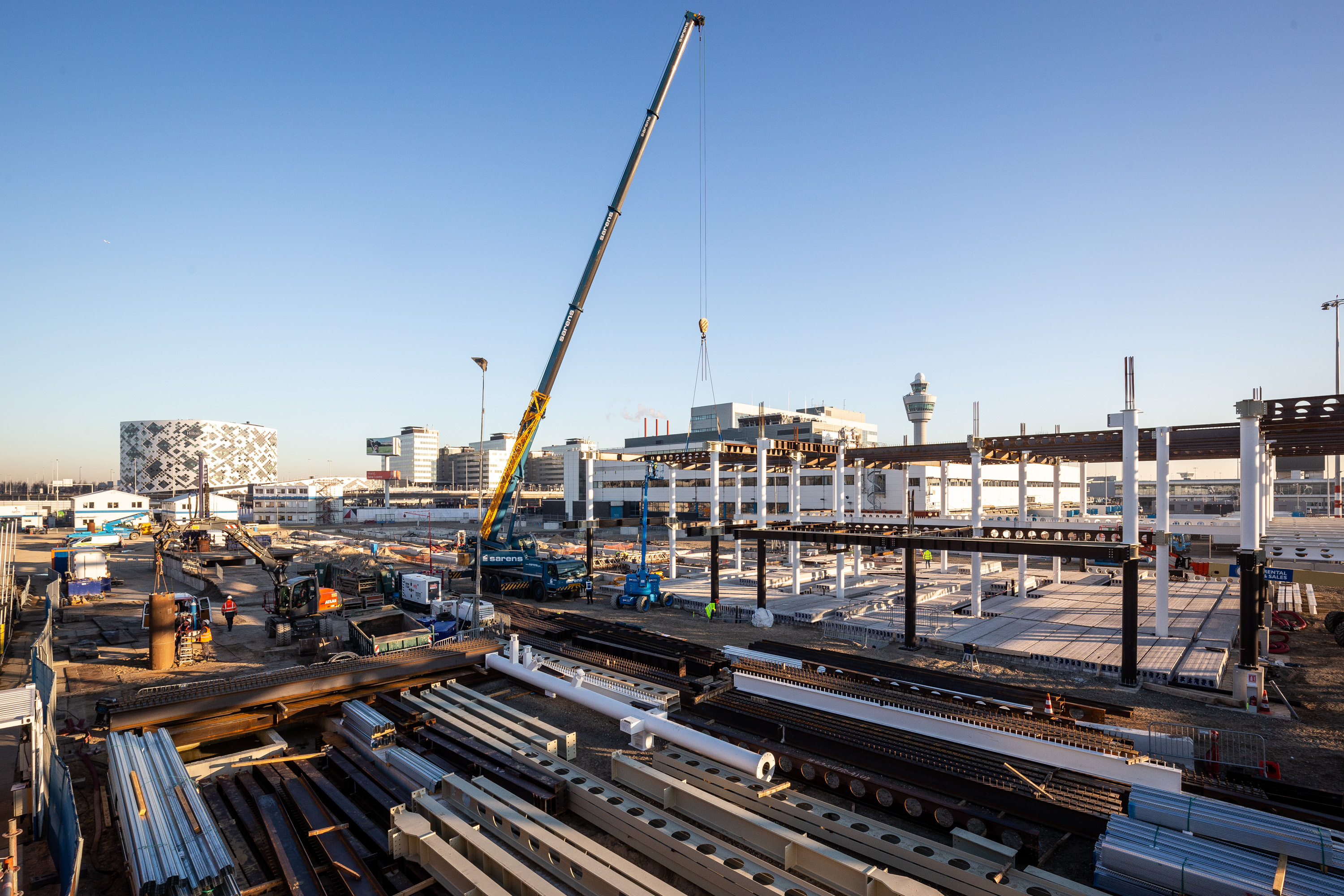 De bouw van de nieuwe pier op de luchthaven Schiphol vordert gestaag en de imposante contouren van het gebouw worden duidelijk zichtbaar.