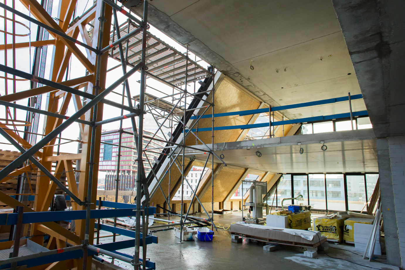 Het hoogste punt zal worden bereikt in de eerste helft van 2019. The Muse wordt gerealiseerd in opdracht van Wilma Wonen. IMd werkt als hoofdconstructeur samen met Barcode Architects en bouwer Smit’s Bouwbedrijf.