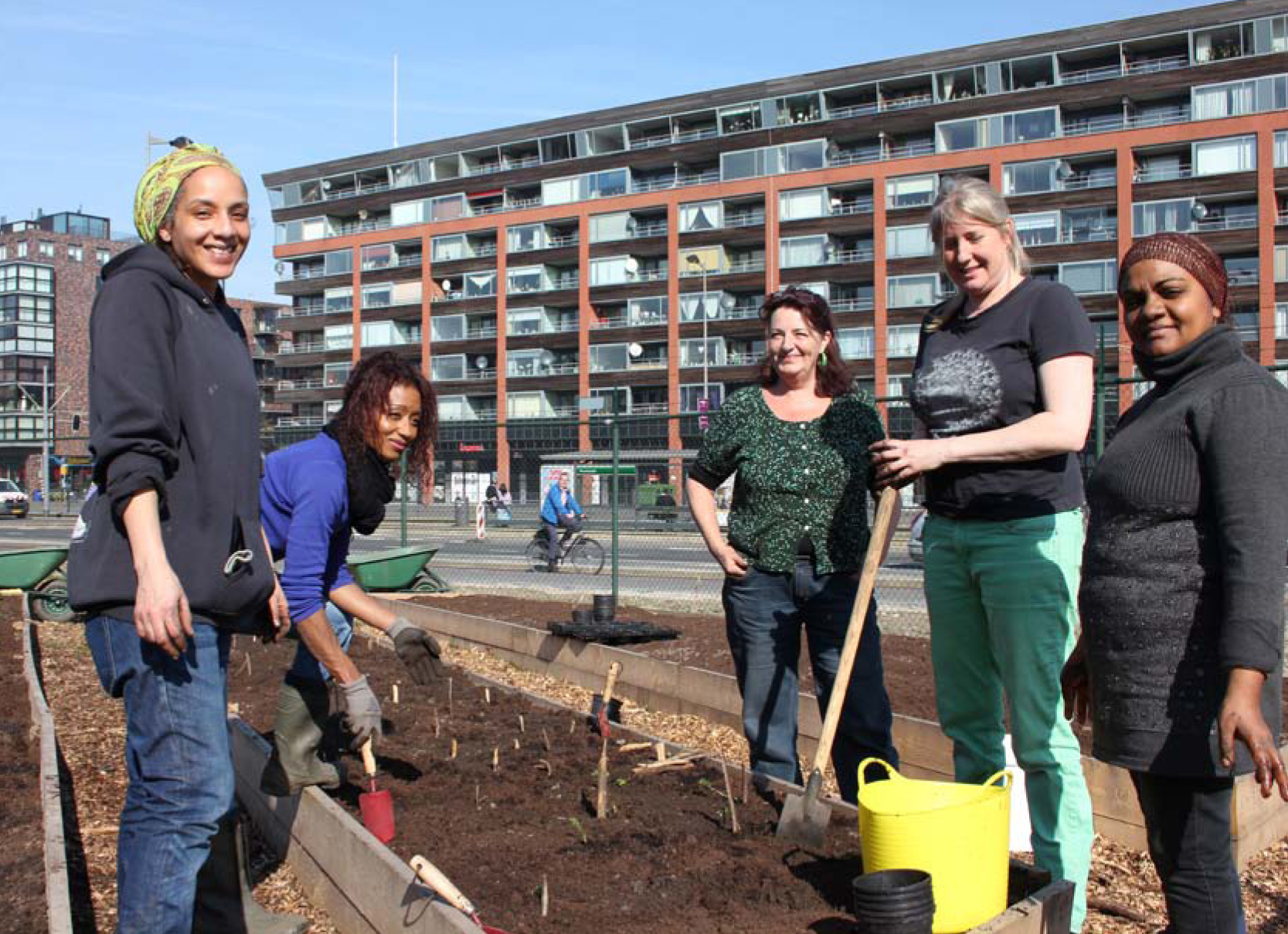 Het voorstel is om een kantoorteelt op te zetten in een langgerekt, laag plantbed van gebruikte steigerplanken aan de Piekstraat-zijde. Alle gewas is eetbaar, gemakkelijk oogstbaar, levert een aantrekkelijk beeld en draagt bij aan een prettig werk- en verblijfsklimaat. De kruiden zijn vooral te gebruiken voor de thee en voor kruidensalades; te oogsten voor een gezamenlijke lunch of voor de medewerkers thuis. Ook worden er enkele groenten en fruitsoorten aangeplant, zoals tomaten en aardbeien.
