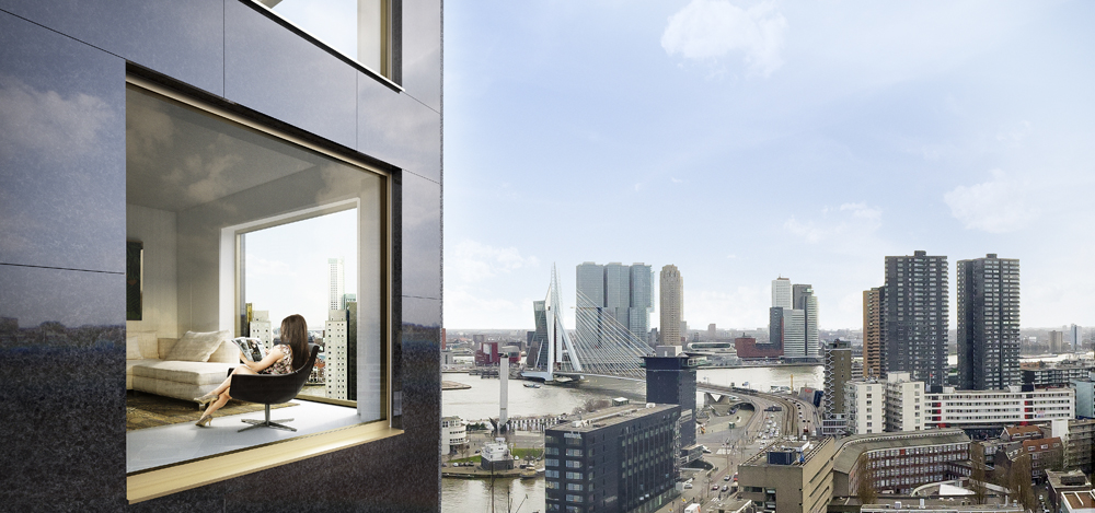 De toren krijgt 140 woningen, met een enorme variatie, zegt Van Dam. De helft huur en de helft koop. De oppervlaktes lopen uiteen van 50 tot en met 315 vierkante meter. Onderin komen grote gezinswoningen met veel buitenruimte.