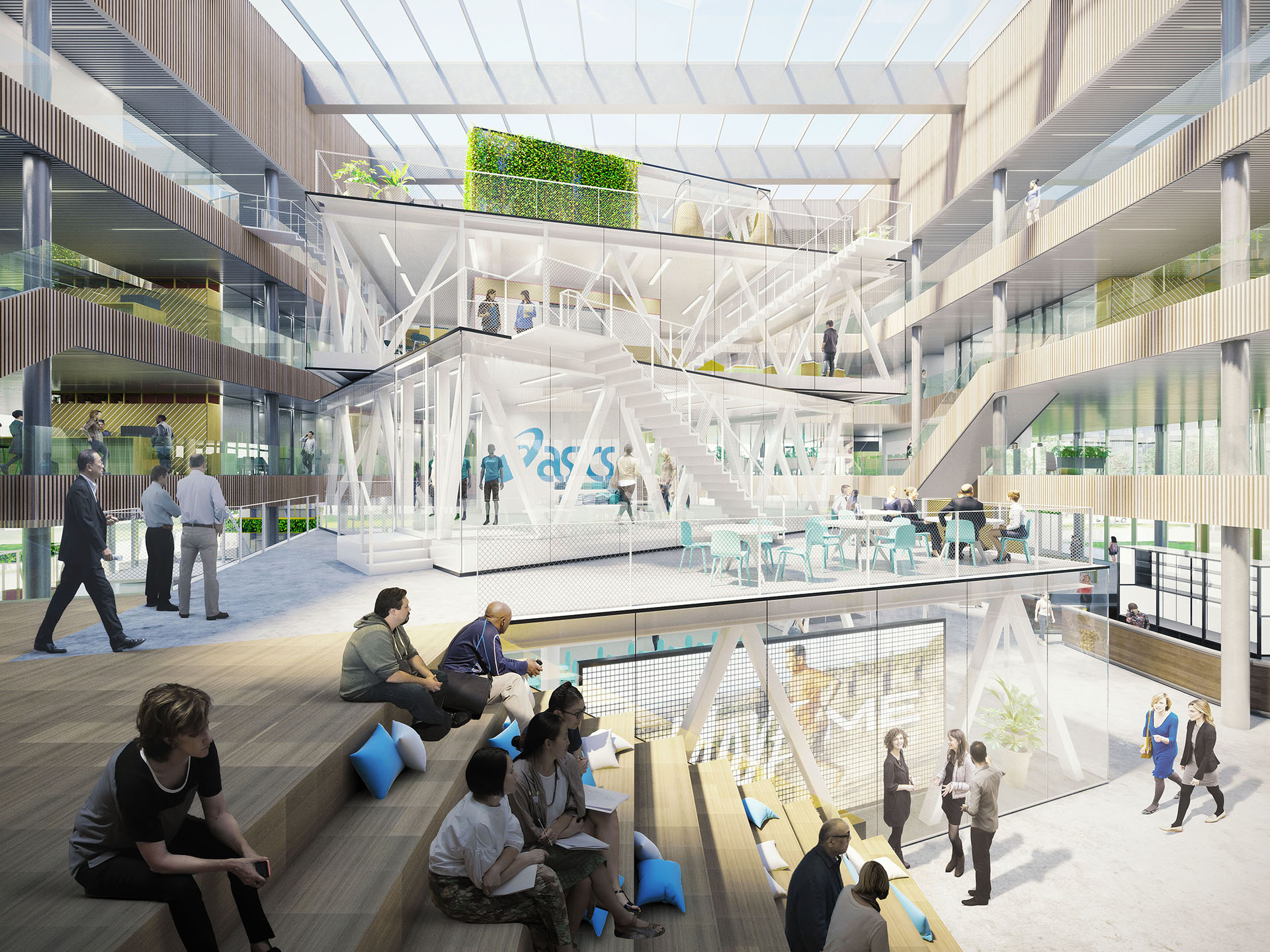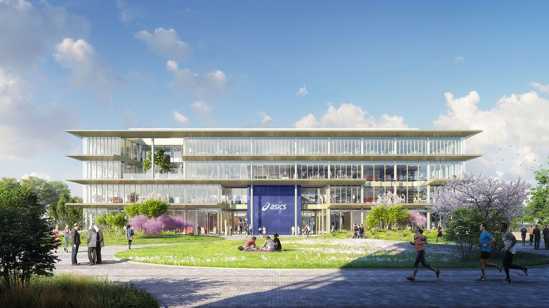 De nieuwbouw voor Asics hoofdkantoor EMEA & Benelux wordt een state-of-the-art kantoorgebouw van vier bouwlagen en is gesitueerd op een half verdiepte parkeerlaag.
