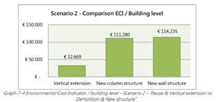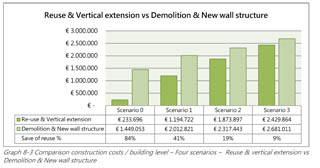 Papageorgiou’s belangrijkste conclusie: meer vierkante meters compenseert in veel gevallen in ruime mate de investering nodig voor de transformatie. En die transformatie en uitbreiding levert een besparing op de milieubelasting van zo’n 70 procent, in vergelijking met sloop en nieuwbouw van hetzelfde volume. Het omslagpunt – wanneer uitbreiding loont, of nieuwbouw toch beter is – is onder meer afhankelijk van de restcapaciteit van de bestaande constructie.