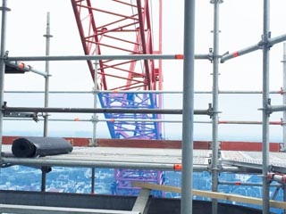 Met slechts enkele voorzieningen is een fundatie gemaakt op de bestaande betonwanden Een kraan op deze wijze plaatsen bespaart veel overlast voor de directe omgeving van het gebouw. Ook een dure fundatie, die na gebruik van de kraan geen functie meer heeft, wordt hiermee voorkomen.