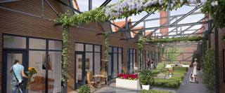 Architectenbureau Braaksma & Roos ontwierp in de hal aan weerszijden woningen. Eigenlijk is ‘in’ niet het goede woord: het dak van het middendeel wordt verwijderd zodat een binnen-buitenruimte ontstaat. Het contrast tussen de oude, markante vakwerkconstructies en de nieuwe architectuur geeft het geheel een meerwaarde die met alleen nieuwbouw nooit mogelijk zou zijn.