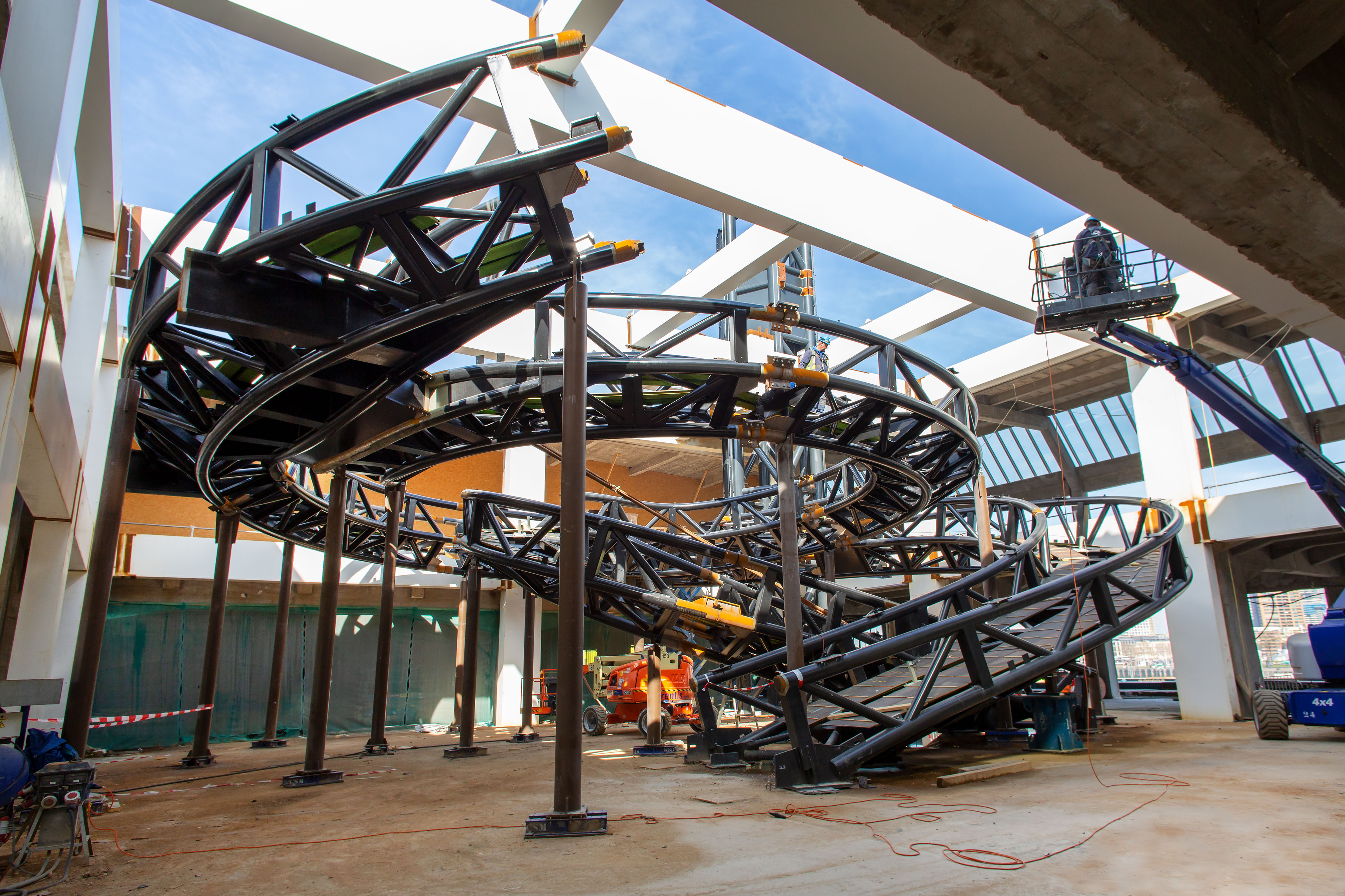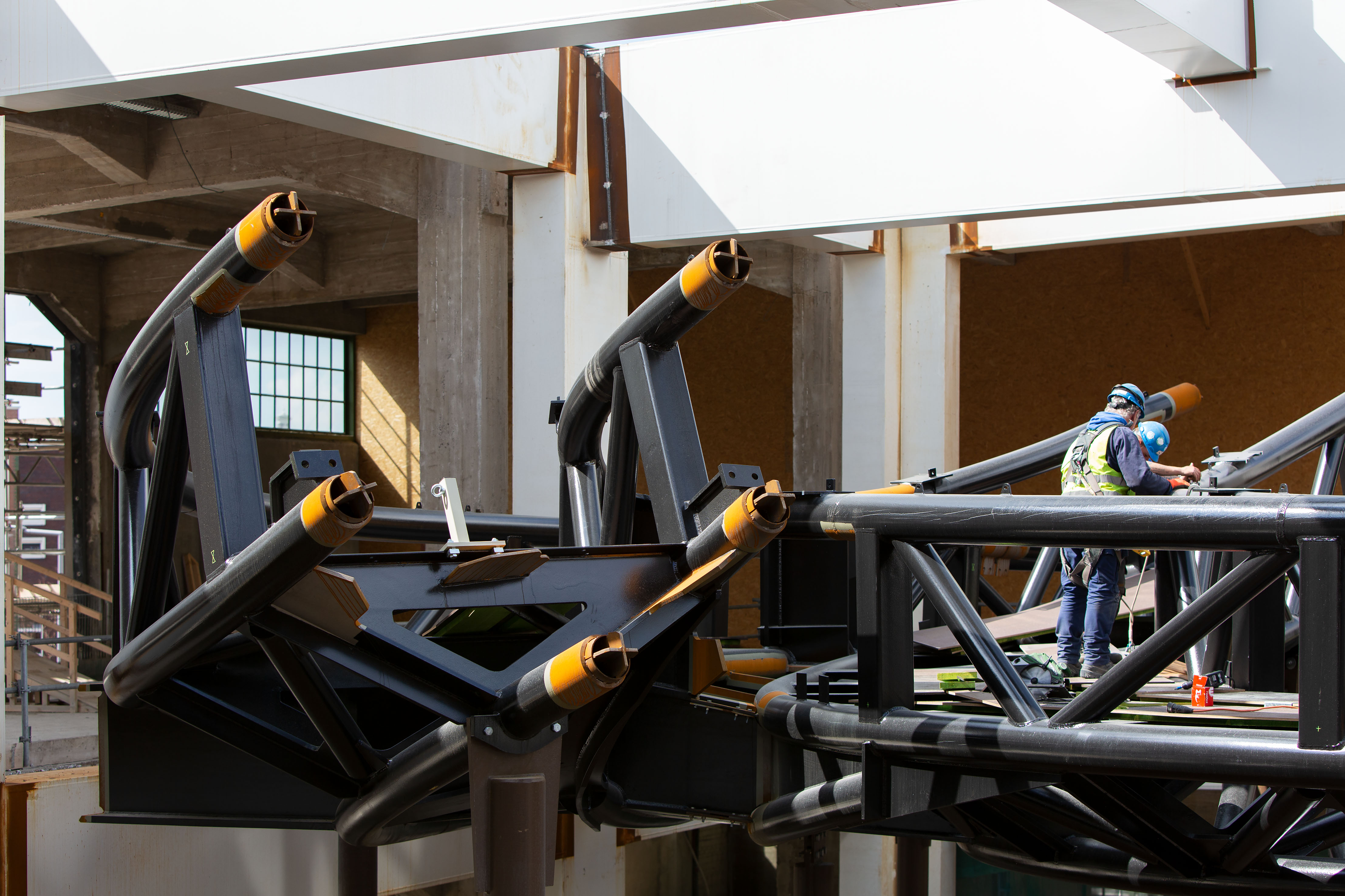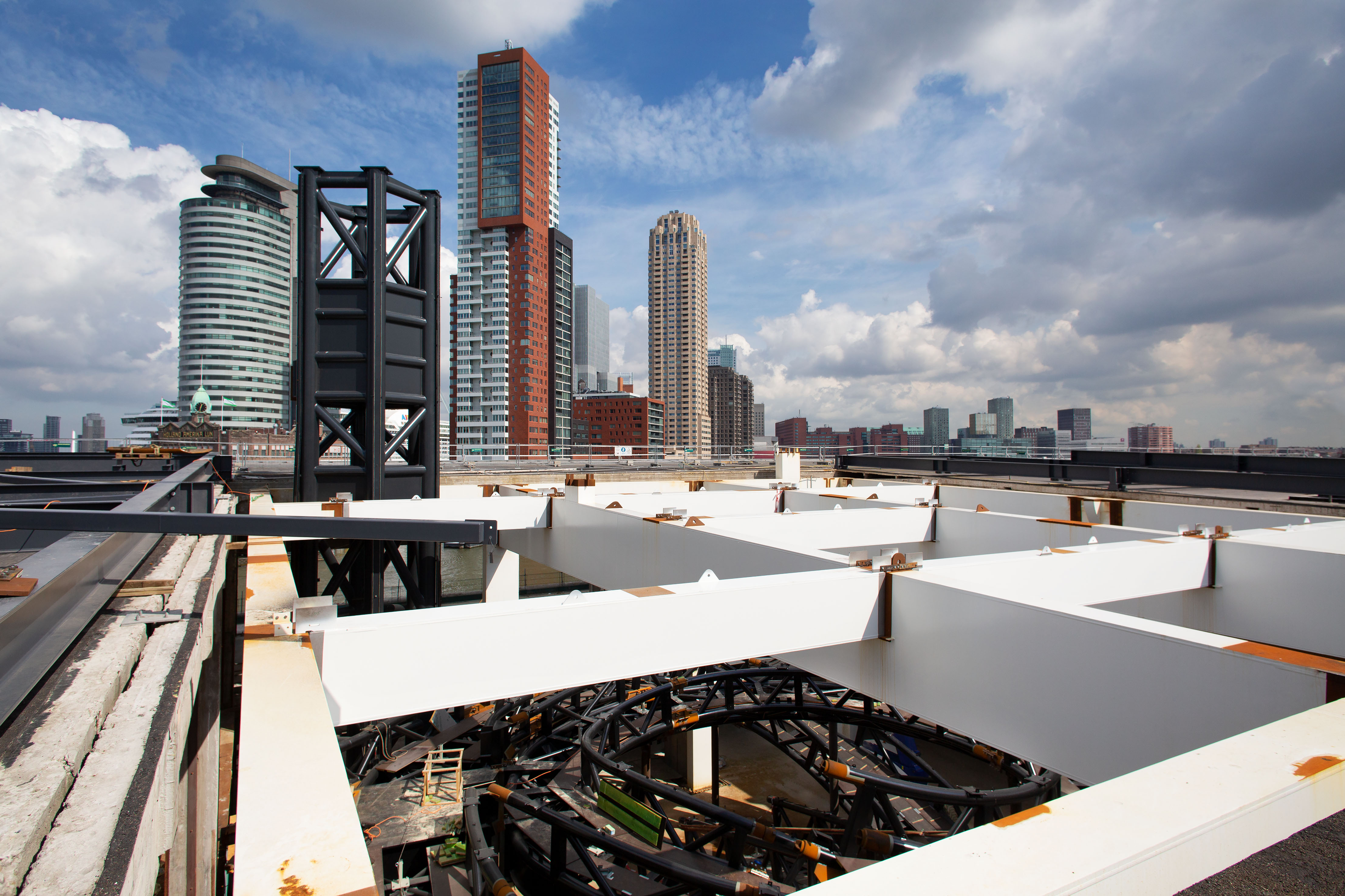In het midden van de loods is een grote sparing gemaakt van ca 25-27m2. Op deze plaats is door MAD architects een tornadovormig kunstwerp ontworpen. Dit kunstwerk dient als loopbrug naar een uitkijkbordes, waarvan men kan genieten van een prachtig uitzicht op de stad. De tornadoconstructie is uitgevoerd als spaceframe van ronde buizen. Dit spaceframe wordt afgewerkt met een roestvast stalen bekleding. In de sparing in de bestaande loods is een tafelconstructie gemaakt waar de tornado geplaatst wordt. Hiermee wordt de tornado losgehouden van de bestaande betonconstructie. Het uitkijkplatform wordt gerealiseerd door grote in twee richtingen uitkragende, stalen liggers. Dit platform wordt horizontaal en verticaal ondersteund door de liftkern. Het dak van de tafelconstructie wordt uitgevoerd met dubbelgekromde glaspanelen. IMd raadgevende Ingenieurs heeft in nauwe samenspraak met MAD architects, staalleverancier CSM en bekledingsleverancier CIG het ontwerp en de berekening van de tornado met uitkijkplatform gemaakt. Hiertoe zijn zeer geevanceerde EEM berekeningen opgesteld en zijn er veel scenario's doorgerekend om tot acceptabel dynamisch gedrag en een robuuste constructie te komen.