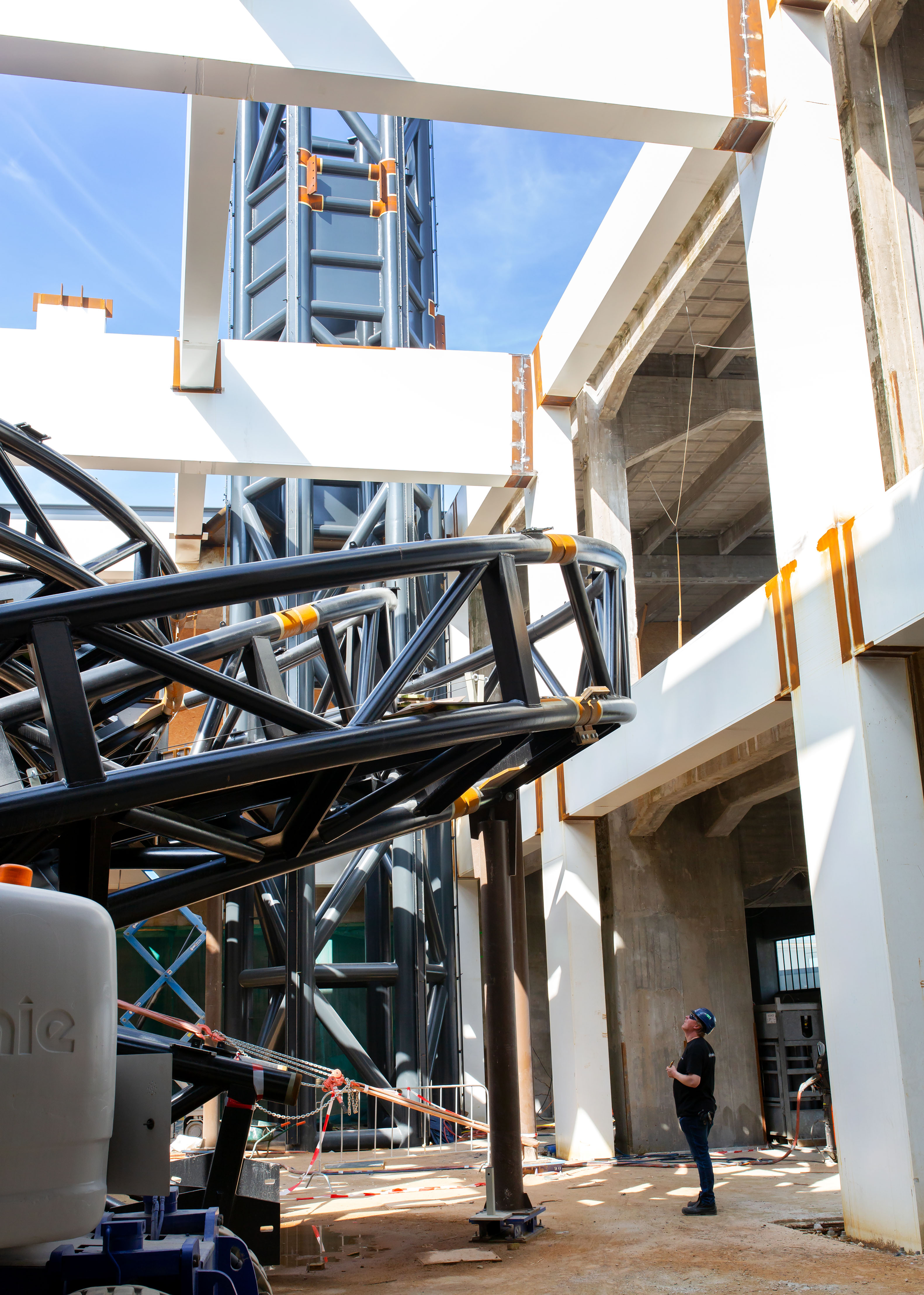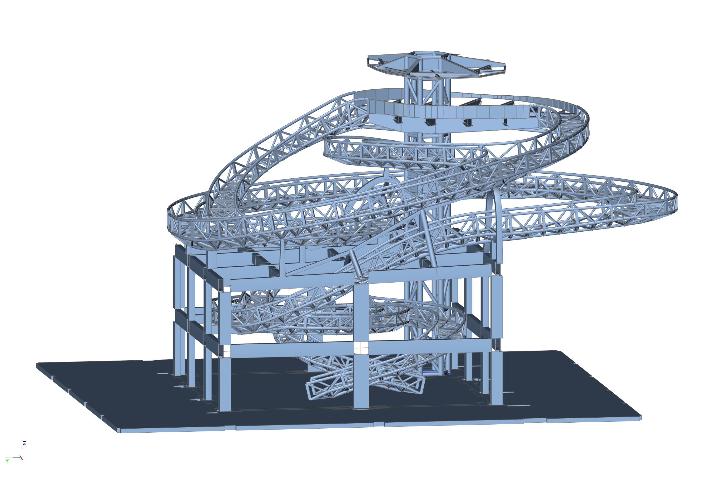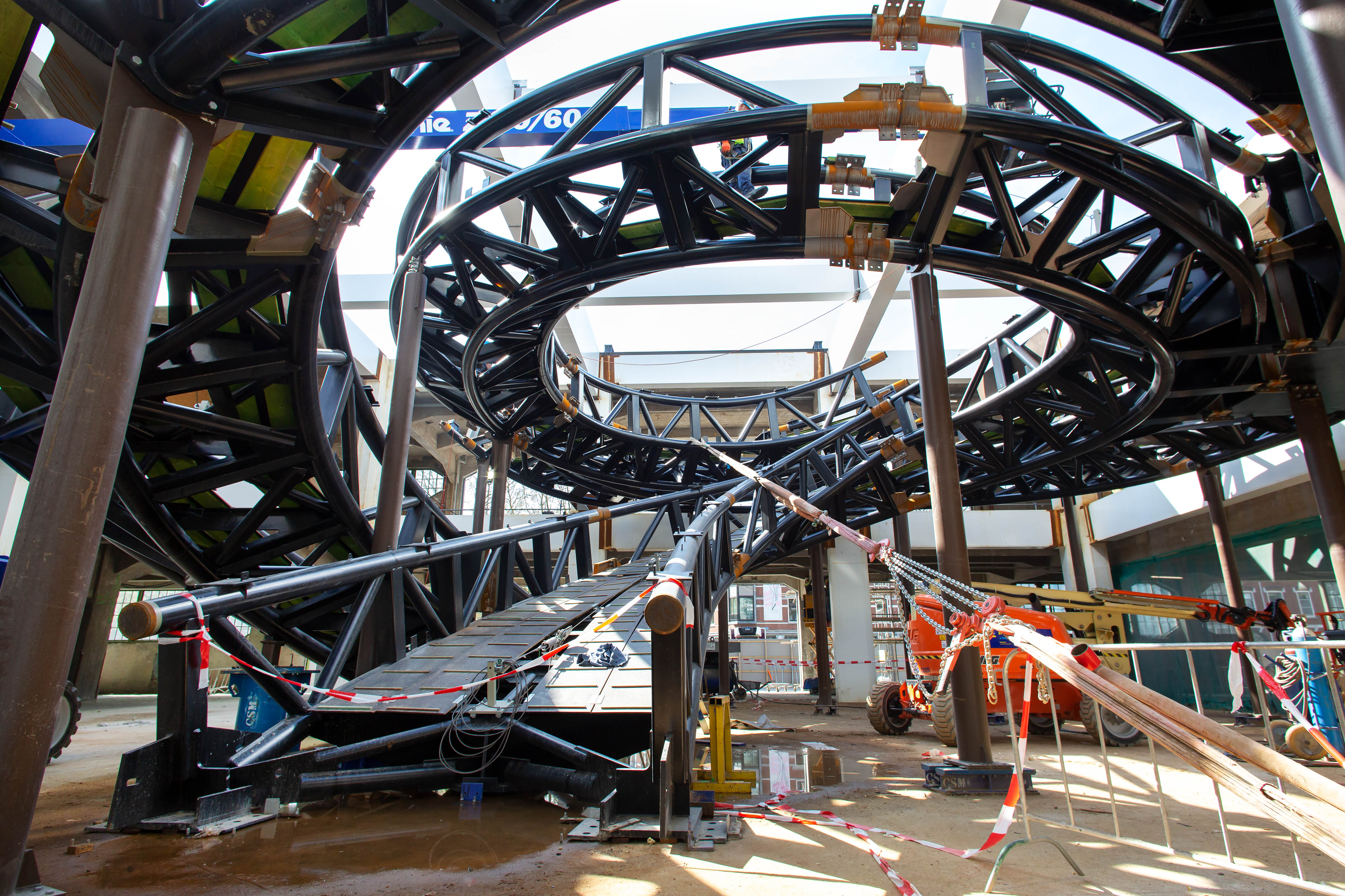 In het midden van de loods is een grote sparing gemaakt van ca 25-27m2. Op deze plaats is door MAD architects een tornadovormig kunstwerp ontworpen. Dit kunstwerk dient als loopbrug naar een uitkijkbordes, waarvan men kan genieten van een prachtig uitzicht op de stad. De tornadoconstructie is uitgevoerd als spaceframe van ronde buizen. Dit spaceframe wordt afgewerkt met een roestvast stalen bekleding. In de sparing in de bestaande loods is een tafelconstructie gemaakt waar de tornado geplaatst wordt. Hiermee wordt de tornado losgehouden van de bestaande betonconstructie. Het uitkijkplatform wordt gerealiseerd door grote in twee richtingen uitkragende, stalen liggers. Dit platform wordt horizontaal en verticaal ondersteund door de liftkern. Het dak van de tafelconstructie wordt uitgevoerd met dubbelgekromde glaspanelen. IMd raadgevende Ingenieurs heeft in nauwe samenspraak met MAD architects, staalleverancier CSM en bekledingsleverancier CIG het ontwerp en de berekening van de tornado met uitkijkplatform gemaakt. Hiertoe zijn zeer geevanceerde EEM berekeningen opgesteld en zijn er veel scenario's doorgerekend om tot acceptabel dynamisch gedrag en een robuuste constructie te komen.